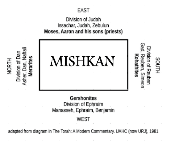 Camp image description: Center is rectangle labeled “Mishkan.” EAST: outside: Division of Judah; then: Issachar, Judah, Zebulun; inside: Moses, Aaron and his sons (priests). SOUTH: outside: Division of Reuben; then: Gad, Reuben, Simeon; inside: Kohathites. WEST: outside: Manasseh, Ephraim, Benjamin; then: Division of Ephraim; inside: Gershonites. NORTH: outside: Division of Dan; then: Asher, Dan, Naftali; inside: Merarites.